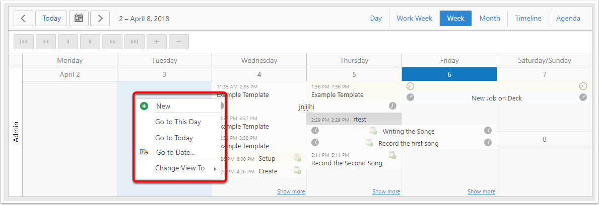 Change View To - day, work week, week, month, timeline, agenda (same as options in top right)